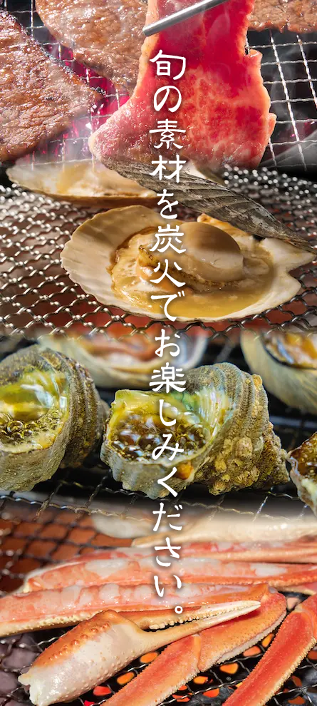 豪華な海鮮の数々を、炭火で楽しむバーベキュースタイル。二大カニの食べ放題や、期間限定で特産のカキも存分にお楽しみ頂けます。海の幸だけでなく山の幸も豊富に取り揃えております。